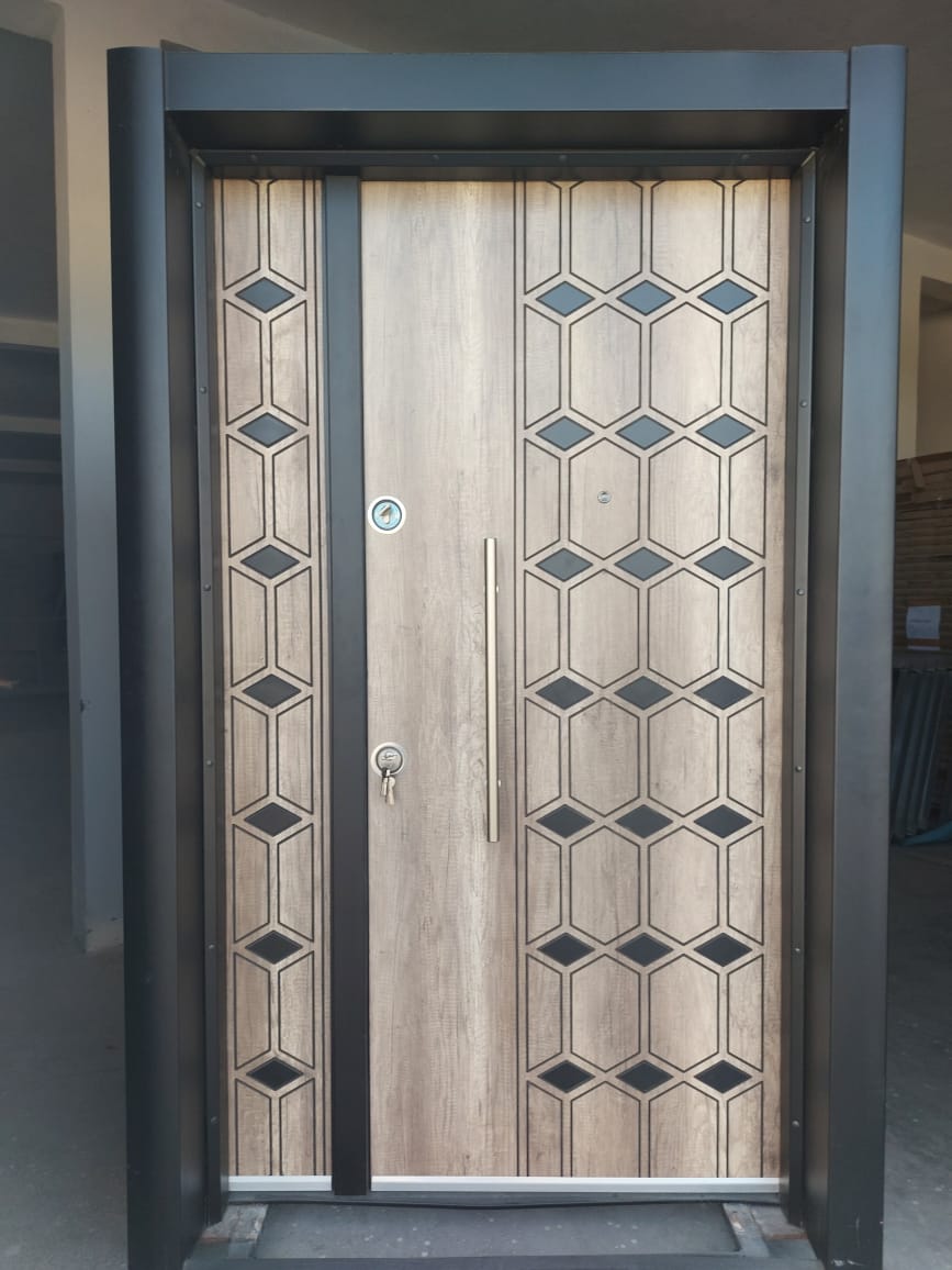 PORTE BLINDEE AVEC CADRE EN FER ET BOND ALUMINIUM EN BAS ET DEUX SERRURES